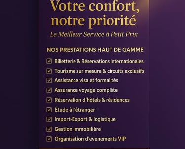 Découvrez nos services de voyage, billetterie, visa, assurance et bien plus encore.