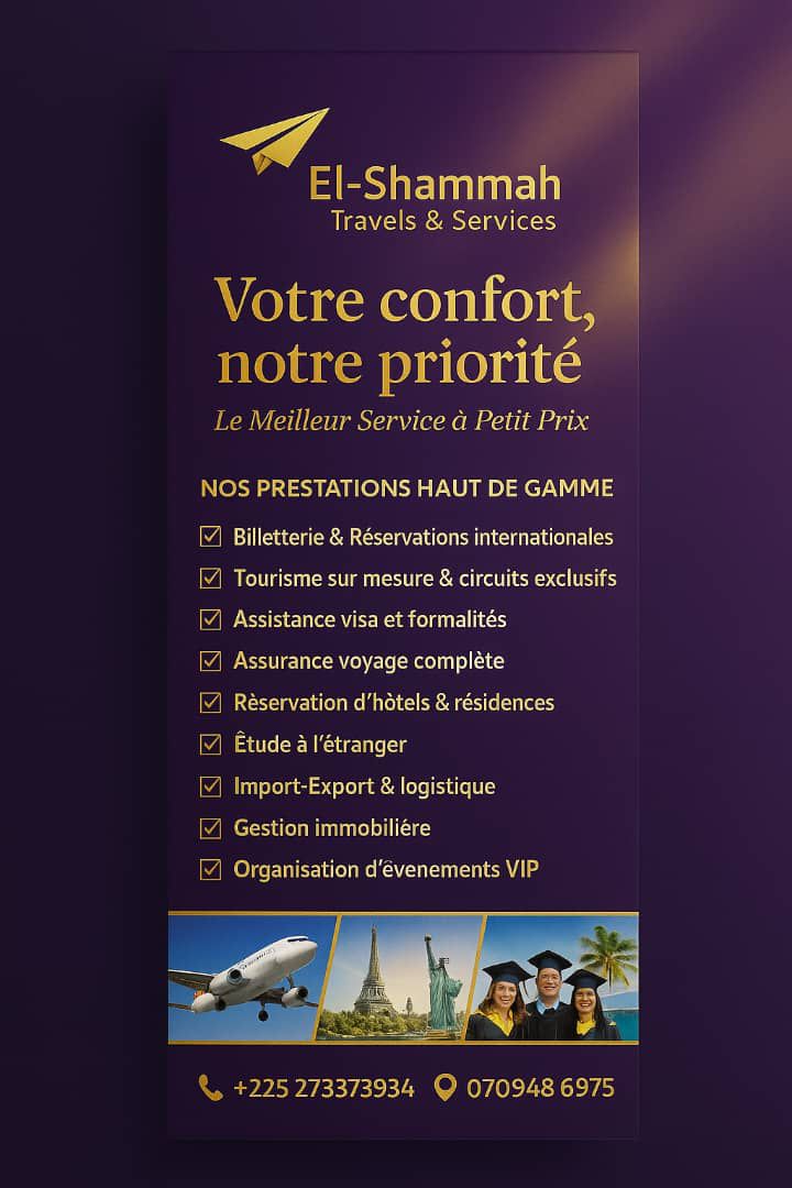 El-Shammah Travels & Services, votre agence de voyage à Abidjan, spécialisée dans la billetterie, l'assistance visa, et bien plus pour un voyage inoubliable.